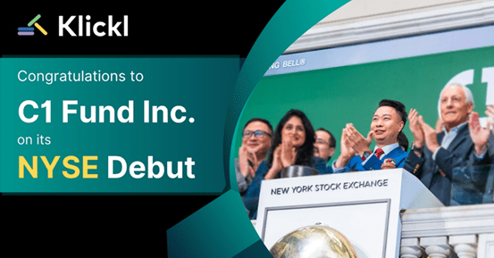نيويورك – (ARAB NEWSWIRE)  أُدرج اليوم صندوق C1 Fund Inc. (NYSE: CFND) في بورصة نيويورك، حيث قام مايكل تشاو، المؤسس المشارك والرئيس التنفيذي لشركة Klickl، بقرع جرس الافتتاح، مما يشكل خطوة هامة نحو تعميم الاستثمارات في الأصول الرقمية المنظمة.