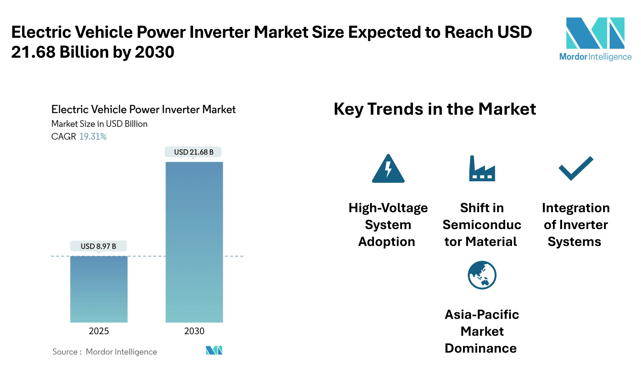 The electric vehicle power inverter market size is estimated at USD 8.97 billion in 2025, and is expected to reach USD 21.68 billion by 2030, at a CAGR of 19.31% during the forecast period (2025-2030). This robust growth reflects the increasing deployment of electric and hybrid vehicles worldwide and the growing demand for more efficient power-electronics architectures. The term “electric vehicle power inverter market” refers specifically to the market for inverters that convert direct current from the battery to alternating current to drive the traction motor in electric vehicles, and increasingly for bidirectional functions as well.