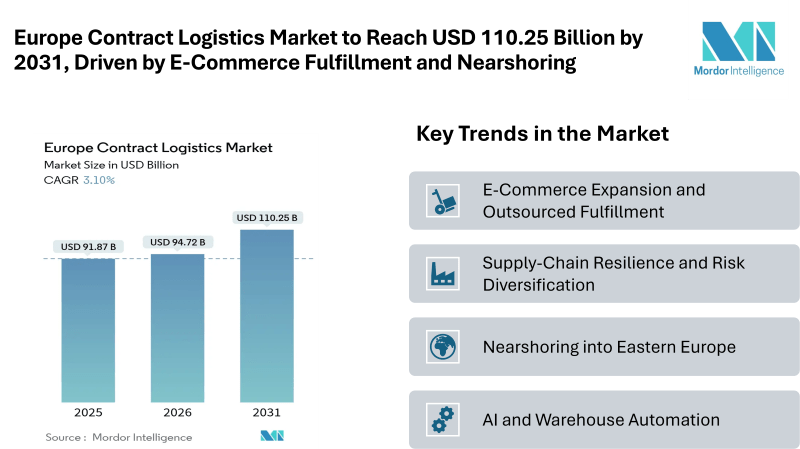 According to Mordor Intelligence, the Europe contract logistics market size is estimated at USD 94.72 billion in 2026, rising from USD 91.87 billion in 2025, and is projected to reach USD 110.25 billion by 2031, registering a CAGR of 3.10%. This steady Europe contract logistics market growth reflects the region’s mature yet adaptive logistics landscape, where outsourcing continues to gain ground across transportation, warehousing, and value-added services.