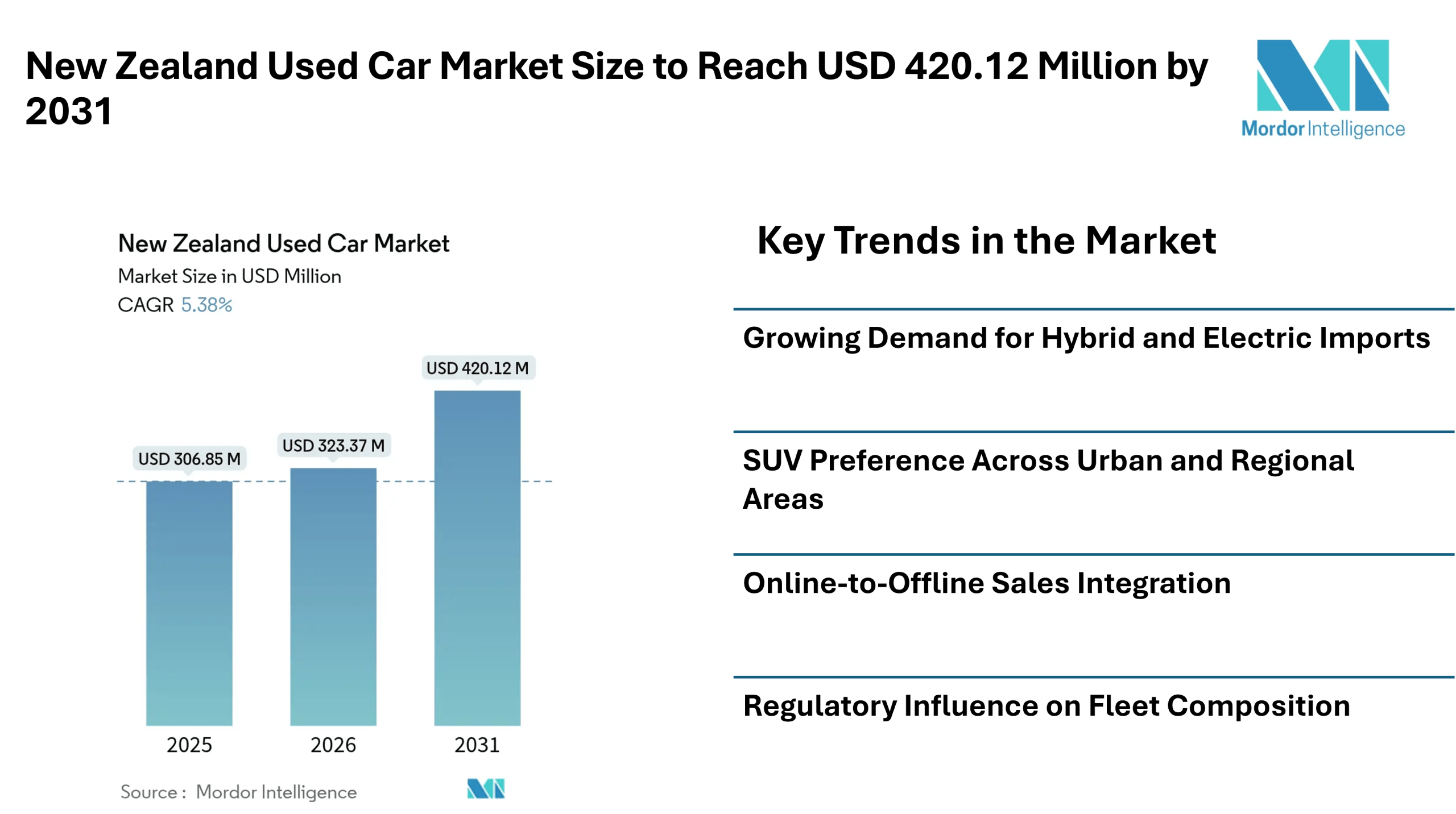 According to Mordor Intelligence, the New zealand used car market size is projected to grow from USD 306.85 million in 2025 to USD 323.37 million in 2026 and is forecast to reach USD 420.12 million by 2031, reflecting steady New zealand used car market growth during the forecast period. The New zealand used car market size is supported by resilient consumer demand, even after policy changes such as the end of the Clean Car Discount and the introduction of road-user charges for battery-electric vehicles.