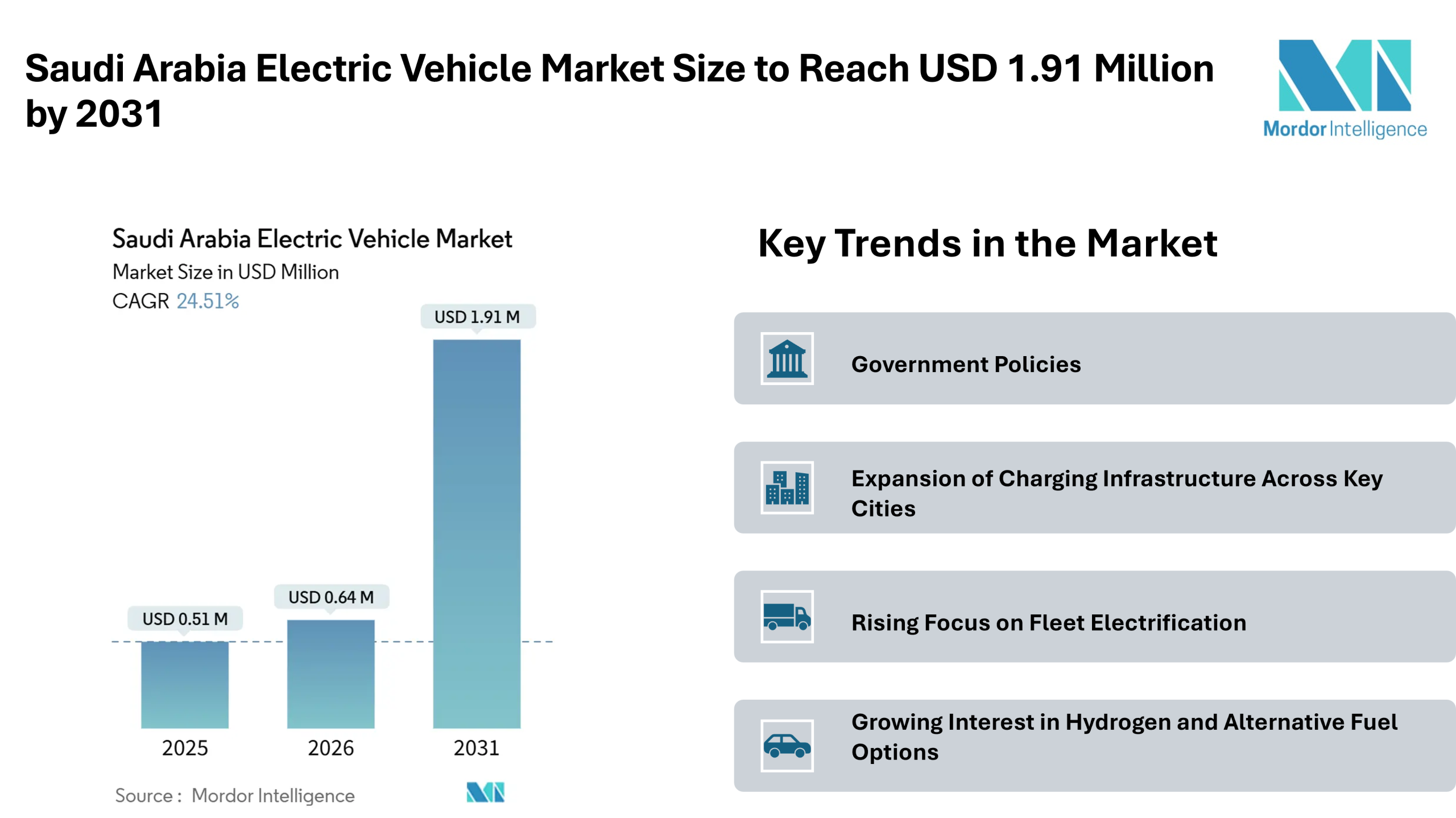According to Mordor Intelligence, the Saudi Arabia electric vehicle market size is expected to grow from USD 0.51 million in 2025 to USD 0.64 million in 2026, and further reach USD 1.91 million by 2031, registering a CAGR of 24.51% during the forecast period. This reflects early-stage development with clear policy backing and infrastructure efforts shaping future demand.