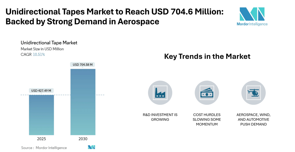 From about USD 427.5 million in 2025, the unidirectional tapes market is expected to climb to roughly USD 704.6 million by 2030, at a healthy projected CAGR of 10.51 percent.